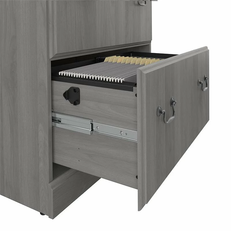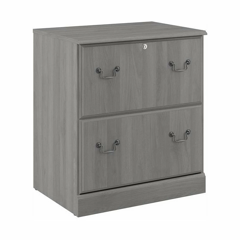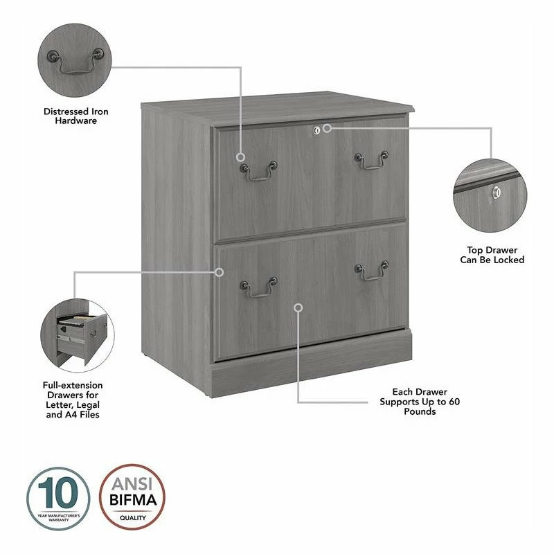 Enjoy the refined elegance of timeless traditional styling while keeping paperwork in order with the Bush Furniture Saratoga 2 Drawer Lateral File Cabinet. A perfect choice for virtually any office or private study, the filing cabinet features two spacious file drawers that accept letter, legal and A4-size documents. Drawers open on smooth full-extension ball bearing slides for an effortless reach to contents and are designed to extend one at a time for maximum stability. Each drawer holds up to 60 pounds of materials, and the upper drawer can be locked to protect your personal information and other sensitive paperwork. The 2 Drawer File Cabinet’s classic appearance is enhanced by decorative edge details and old-fashioned drop handle drawer pulls. This locking File Cabinet has been tested to meet ANSI/BIFMA quality standards for safety and performance and is backed by a 10 Year Warranty.