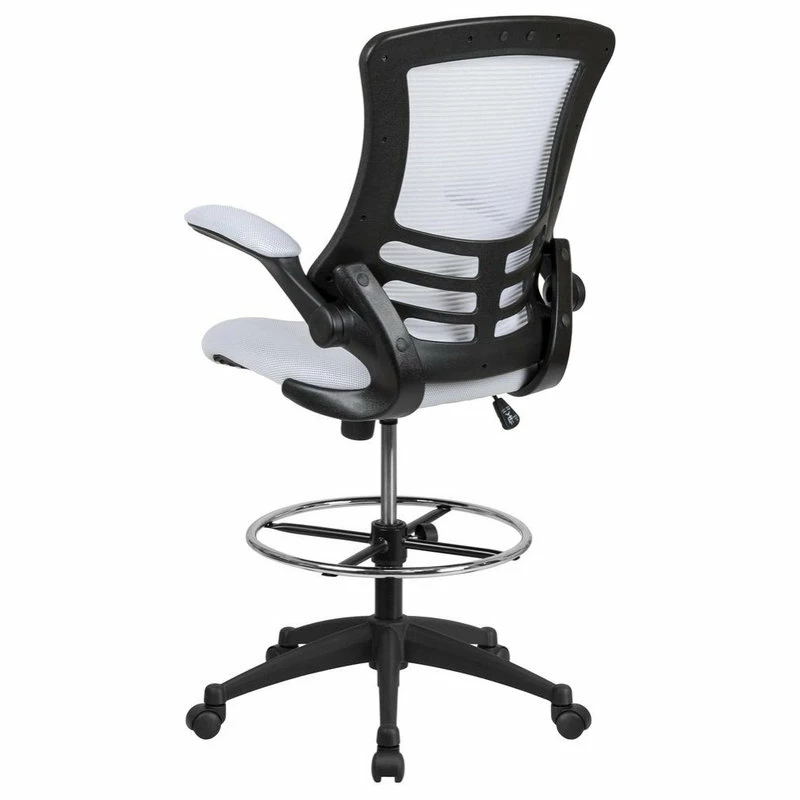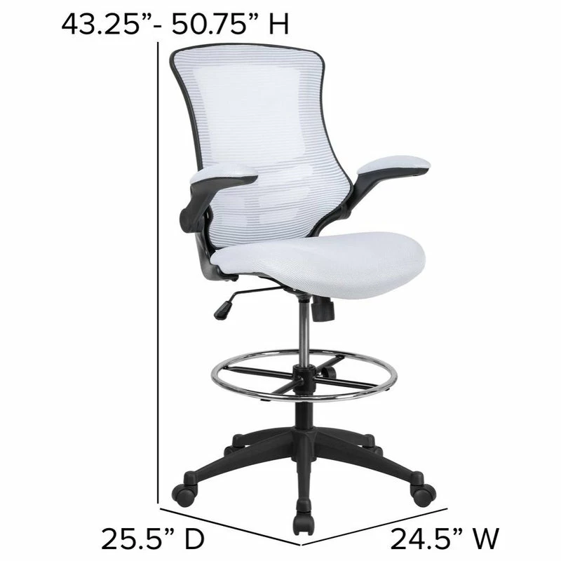 Whether you work from home or go into the office you will be comfortable with the Mid-Back White Mesh Ergonomic Drafting Chair with Adjustable Foot Ring and Flip-Up Arms. This tall task chair is the perfect height for sit-to-stand desks, standing desks, bar height tables and drafting tables. Enjoy the comforts of an ergonomic chair in a taller frame to meet the needs of students and professionals working at above average desk heights. No more miserable summer days at work when you have a mesh back office chair that will keep airflow circulating. The curved back cradles you while offering built-in lumbar support. Designed with your comfort in mind, this drafting stool has invaluable features: 360 degree swivel seat ~ pressure relieving waterfall edge ~ flip-up arms when you want an armless design ~ tilt lock mechanism with variable tension control ~ height adjustable foot ring and dual wheel casters to roll across all flooring with ease. Draft chairs are essential for any profession where work surfaces are above standard height, such as lab technicians, architects, graphic artists, or any other creative assignment. They can also make a great chair for any job requiring employees to be at eye contact level with customers, such as receptionists or cashiers. Complete all tasks on this stylish draft chair that’ll keep you cool and comfortable throughout your workday.