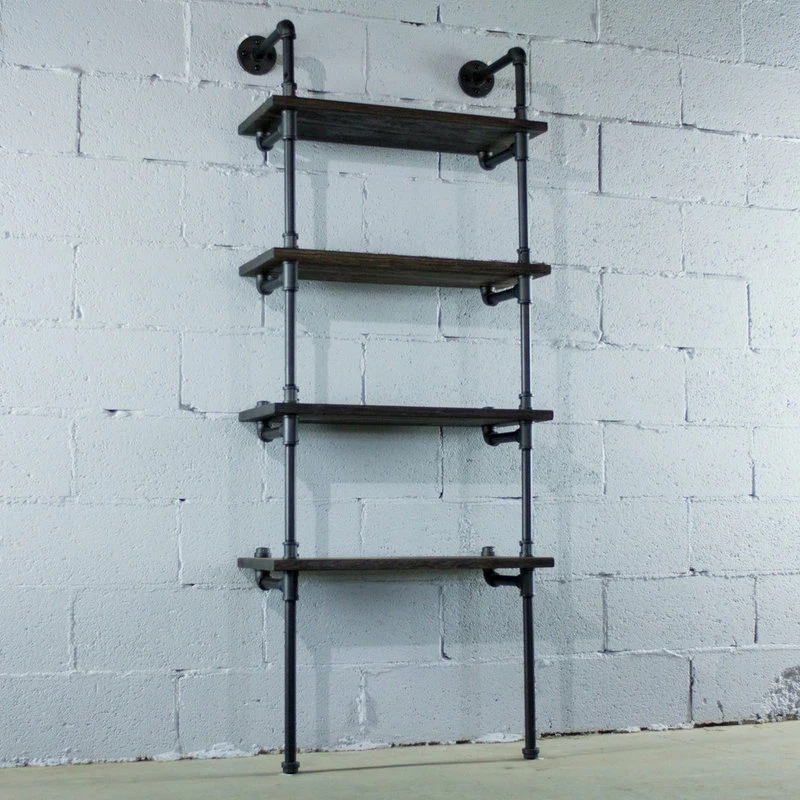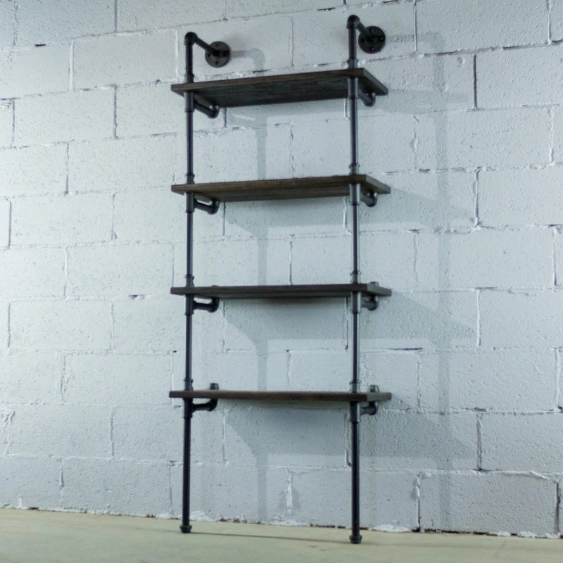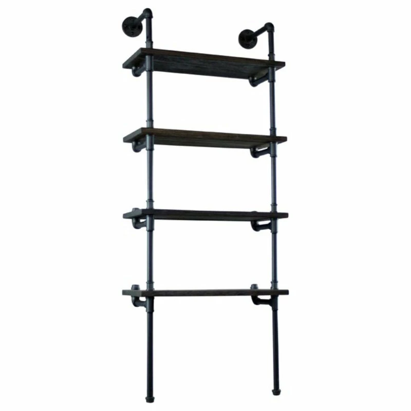 Add modern and industrial chic character to any office or living space with this easily wall mounted space saving 4-shelf pipe bookcase/etagere. The 67-inch Sacramento industrial chic bookcase/etagere is crafted with precision from sustainable solid Paulownia (lightest to strongest ratio wood species in the world); wood with a rustic reclaimed/aged finish. Fashioned with an aged vintage metal finish the recyclable aircraft grade aluminum pipes and flash plated fittings create a bold fashion statement! The top two flanges contain two display screws and two real to minimize mounting time. The difference is four total holes in the wall verses eight. If extra stability is needed the display screws can be removed and then screwed fully into the wall. The durable and lightweight Sacramento design is exceptional! It is easy to assemble has ample floor space for storage for baskets and provides easy access to keep your floors clean. This etagere can be used to store clothing dishes books plants and more! With a low VOC finish recyclable metals sustainable wood and 100% recyclable packaging your home and planet are sure to beam a healthy smile in approval!