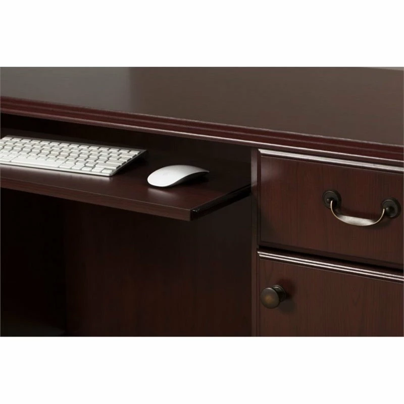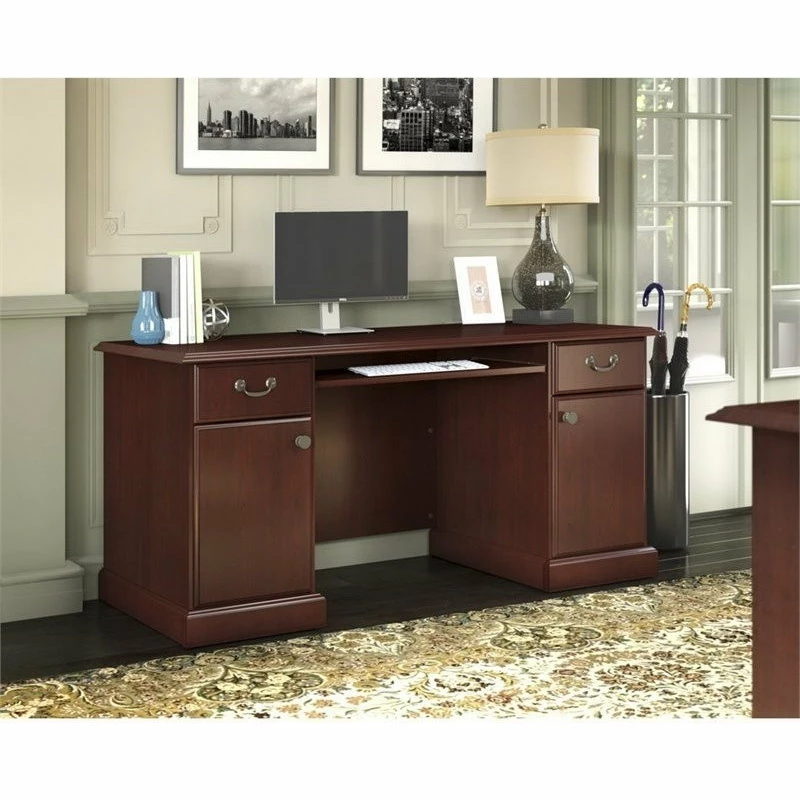 Add a sense of timeless style and tradition to your home or workspace with the Bennington Credenza from kathy irelandยฎ Office by Bush Business Furniture. The rich Harvest Cherry finish, antique brass accents and decorative detailing provide a classic look you’ll love for years. Spread out and work comfortably, this product features a generously sized work surface constructed of thermally fused laminate for incredible durability and resistance to scratches and stains. The convenient, wide pull-out keyboard shelf frees up valuable work surface space. Double pedestal design includes two box files for general supplies and two concealed storage compartments with an adjustable/removable shelf inside. Compartments also feature a wire pass through slot making it a perfect spot for CPU or other electronic devices. Built to last, this product meets ANSI BIFMA furniture standards for safety and performance backed by a 6 year warranty. For classic styling with old-world charm choose the Bennington Credenza. And for a total office solution, see the full Collection for coordinating items available.