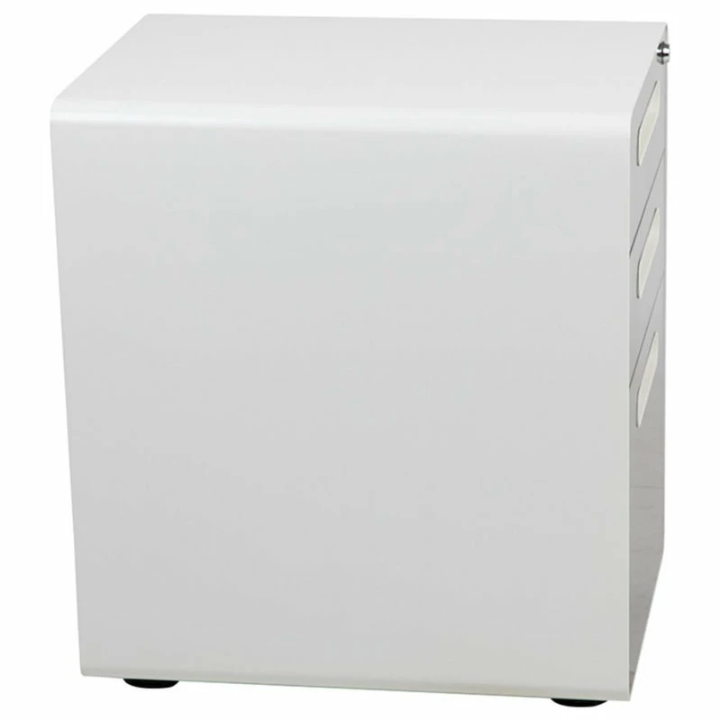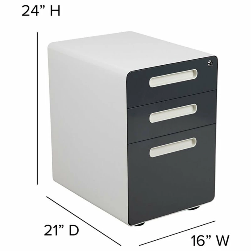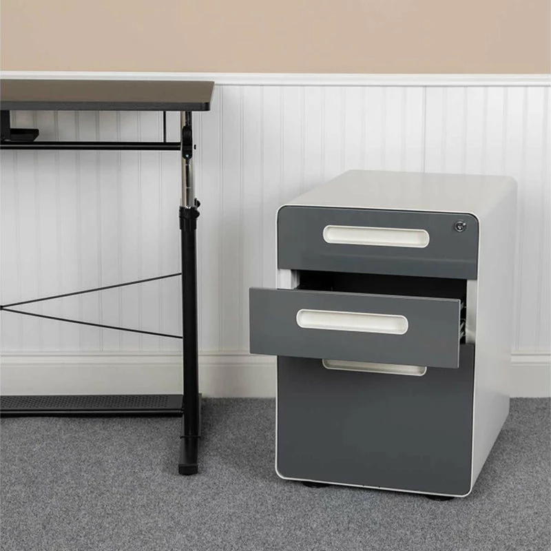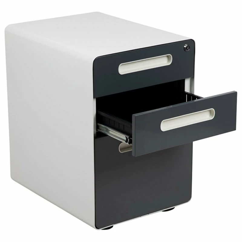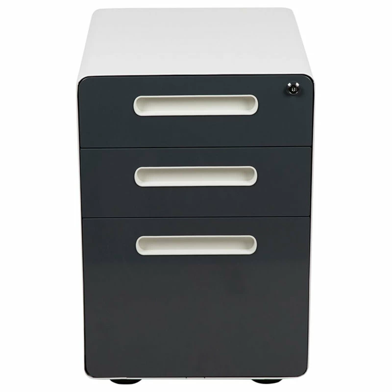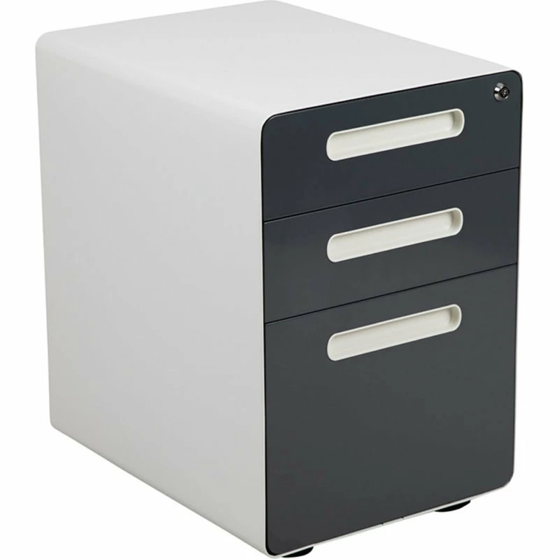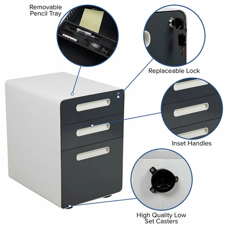 You may love your current desk but have nowhere to store your paperwork without cluttering the desktop, insert this locking file cabinet to keep the minimalistic appearance of your modern office desk. This 3-drawer pedestal file cabinet has low set casters to keep up with the needs of a busy worker. The convenience of casters is ideal for employees who regularly file documents, allowing them the option to pull the cabinet near them while monitoring incoming emails. The modern 3-drawer mobile file cabinet has two utility drawers to hold your small office supplies, snacks, vitamins and writing utensils while the hanging file drawer holds A4, letter, legal, and F4 hanging folders. An included pencil tray keeps your small supplies neatly stored and can be used in either of the two utility drawers. Two keys are included to keep in separate locations or as a duplicate for your assistant. Inset drawer handles provide a modern appearance and a worry-free solution to loosening handle screws. Organize your office space with this mobile under desk filing cabinet that comes fully assembled and ready-to-use. This ergonomic filing cabinet is a smart solution for any workplace whether used for heavy-duty daily filing or the casual user. Modern 3-Drawer Filing Cabinet with White Frame and Charcoal Faceplate. Pencil tray holds writing utensils and small office supplies.