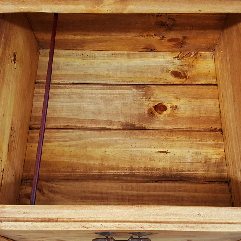 Wood Filing Cabinet with 2 Drawers in a rustic finish. Has a medium tone stain and wax finish to keep the look of a rustic piece. Includes metal rails for filing papers. Each drawer has two rails that are adjustable for letter or legal size documents. Beautiful wrought iron rusted pulls.