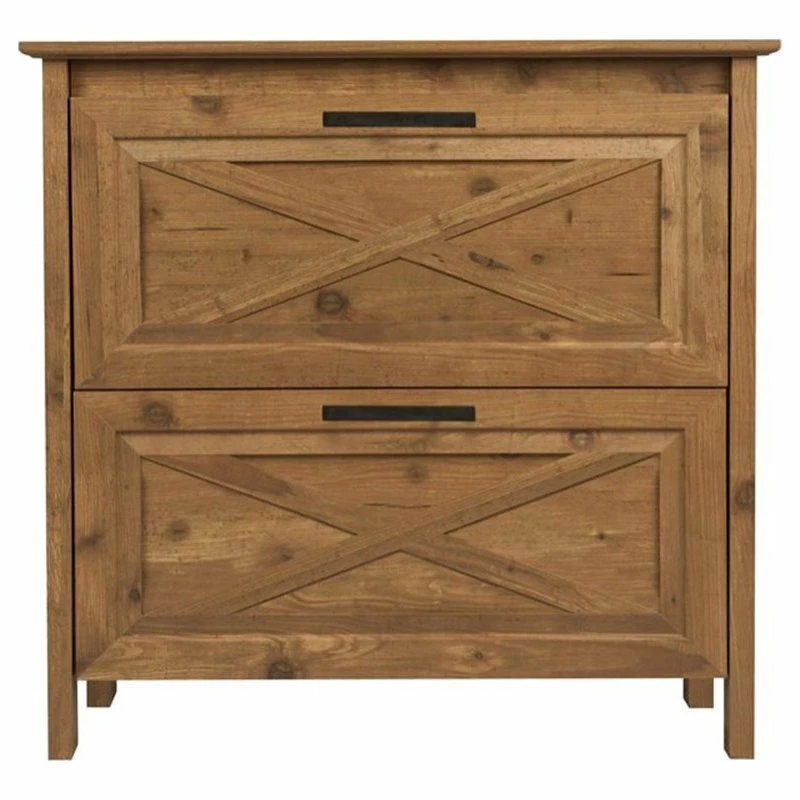 Give any office a charming style upgrade with this rustic filing cabinet. Equipped with two soft-closing drawers, this cabinet accommodates both legal and letter size files for all your document storage needs. The attractive, country-inspired design showcases x-shaped drawer fronts with rugged metal handles and rich wood grain accents for classic rustic charm.
