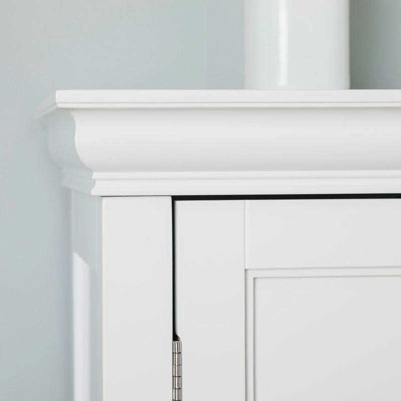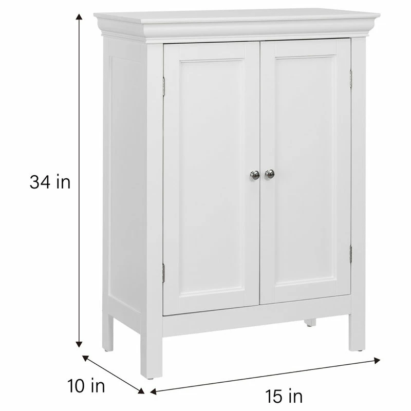 Upgrade your home storage while adding modern style with the Elegant Home Fashions Stratford Wooden Floor Cabinet with 2 Shelves. This decorative cabinet features a sophisticated white finish with chrome-finished hardware, clear door knobs, and a minimalist silhouette for a beautiful addition to your space. The 2 included adjustable interior shelves make this cabinet a functional solution to your storage needs. Constructed from durable engineered wood, this storage unit is built to provide you with long-lasting organization. Easy, step-by-step instructions and all of the hardware needed for installation are included for quick assembly. Purchase this stylish floor cabinet alone or with other items from the Stratford collection for a cohesive, updated look. The Elegant Home Fashions Stratford Wooden Floor Cabinet with 2 Shelves measures 15″ x 34″ x 10″ to provide accessible storage without taking up too much space in your living area or bathroom.