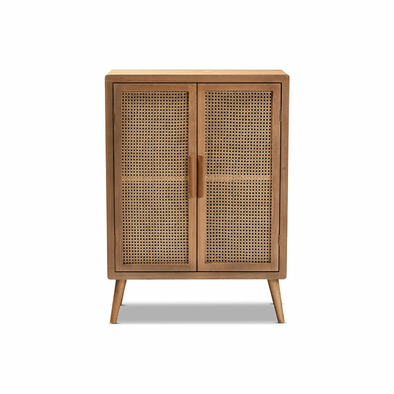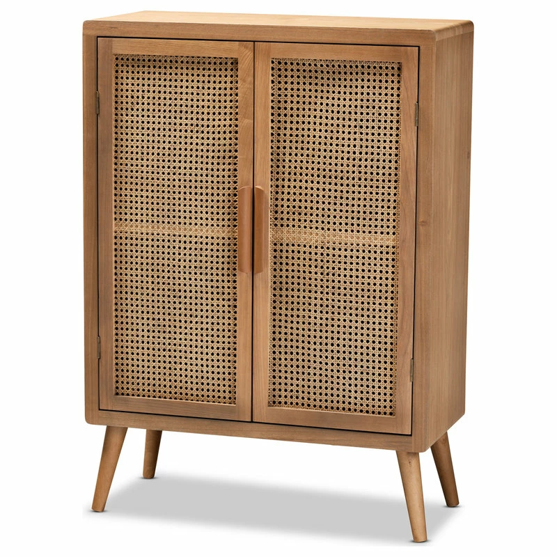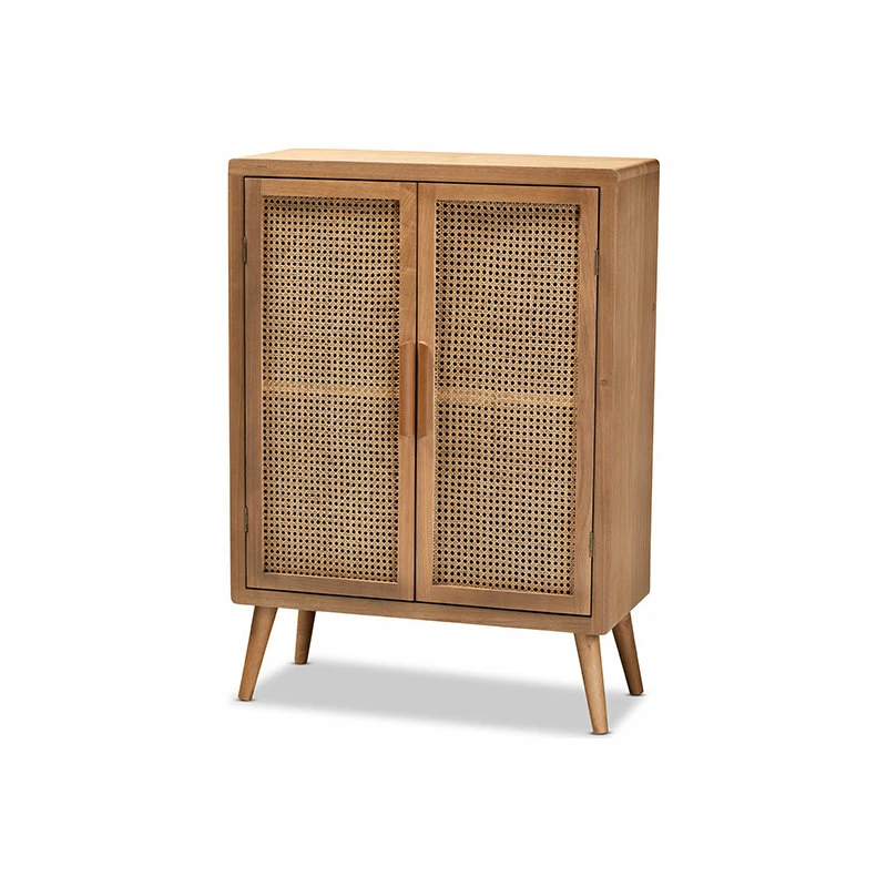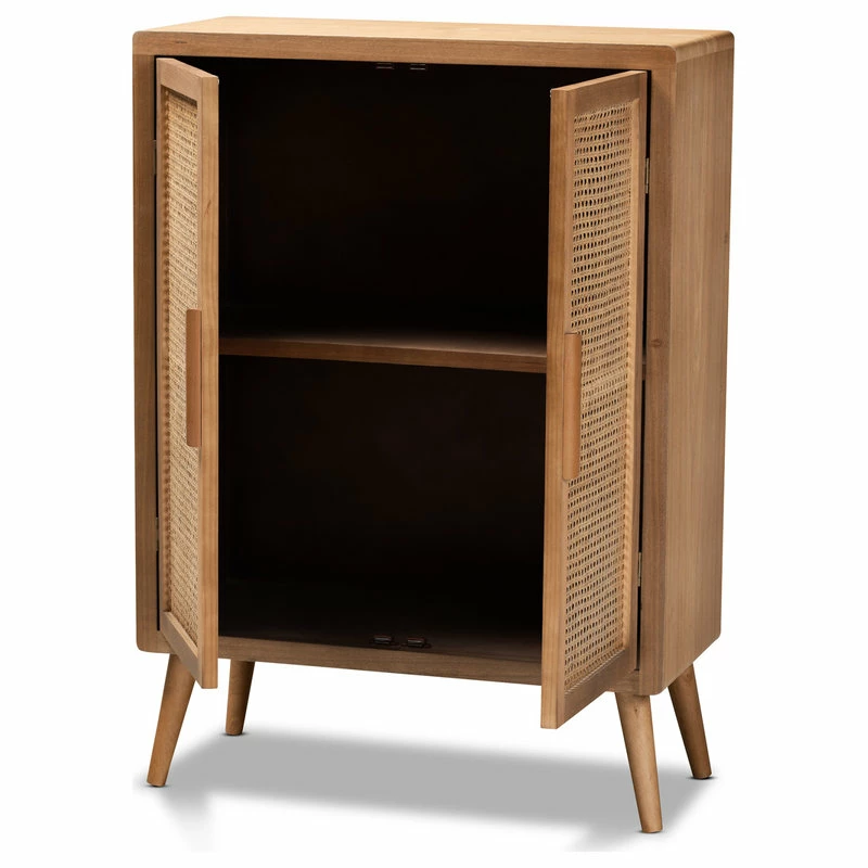 Cultivate a fresh, retro feel in any space with the Alina cabinet. This sturdy wood cabinet showcases a medium oak finish for a look that s both warm and inviting. Two shelves, behind two doors, provide ample space to keep items organized and out of sight. Woven rattan adds a cool, bohemian vibe, while angled legs and long wooden handles lend mid-century charm. The Alina cabinet is made in China and requires assembly.