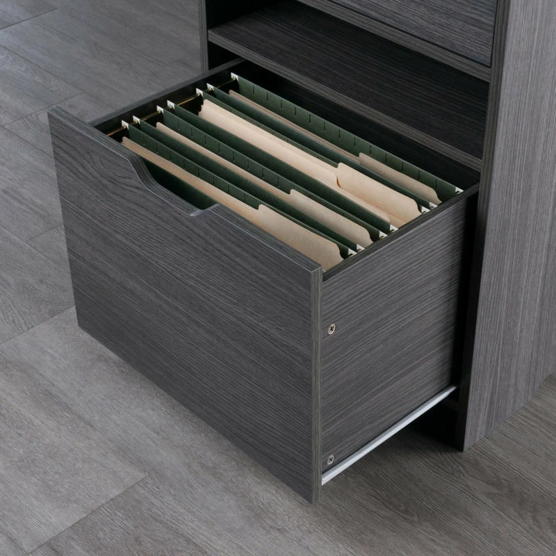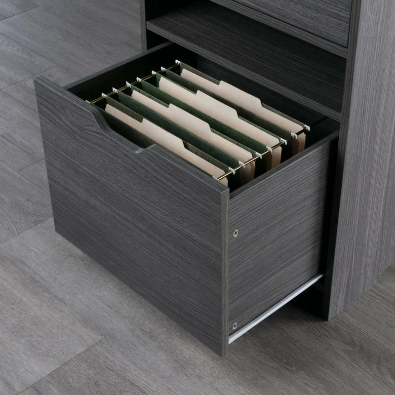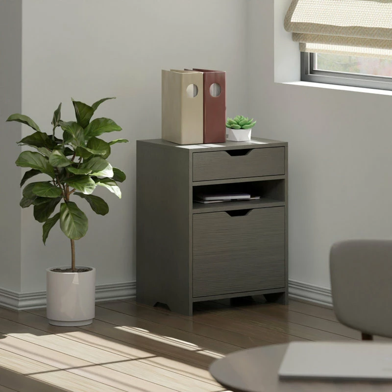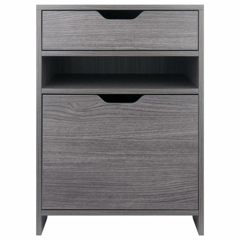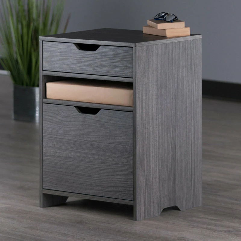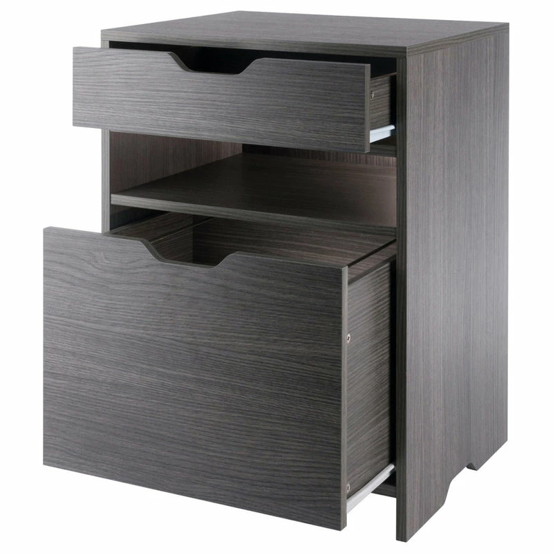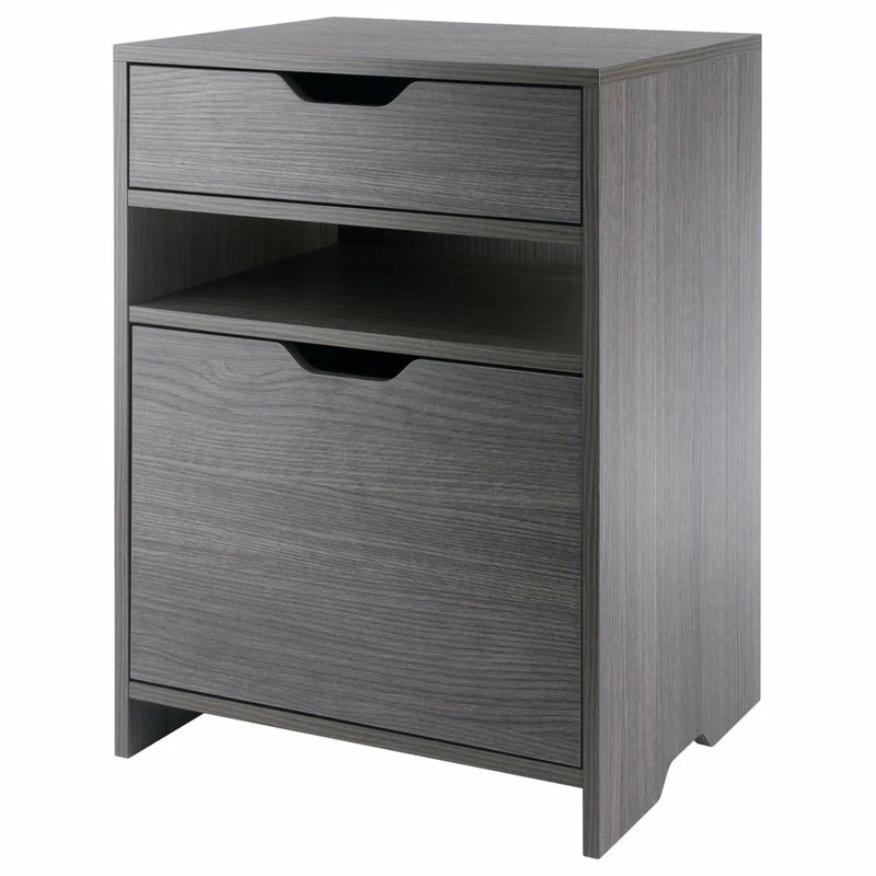 The Nova Filing Cabinet with Drawer offers a streamlined way to transform any room where you need stylish, easy-access storage. The Cabinet is ideal in a home office for keeping important paperwork and documents close at hand while doubling as a printer stand. Remove the file rods and it’s a great organizer in a garage or shed for tools and gardening equipment. Or use it as a side table in a child’s bedroom to reduce the clutter of toys, electronics, and sports gear. The file rods are adjustable to fit either legal or letter size files. And both the drawer and cubby add extra storage. The cut-out handles and wood-grained Charcoal finish provide a contemporary, simple look that will work well with almost any decor. For additional storage, combine the Nova Filing Cabinet with other organizers from the Winsome Nova collection. Made of sturdy composite wood, with all the hardware needed for assembly. The Nova Filing Cabinet with Drawer offers a contemporary, streamlined look in storage for any room. Made of sturdy composite wood in a Charcoal finish, the Cabinet has a drawer, an open shelf, and a file cabinet suitable for both legal and letter size files. Remove the file rods to create a great option for a variety of storage needs. Use it in a home office, craft room, bathroom, or bedroom, wherever you could use stylish and simple storage. Filing Cabinet with Drawer and open shelf. File cabinet fits legal and letter sizes. Overall size: 19.2″W x 15.9″D x 26.3″H. Cut-out handles. Wood-grained Charcoal.
